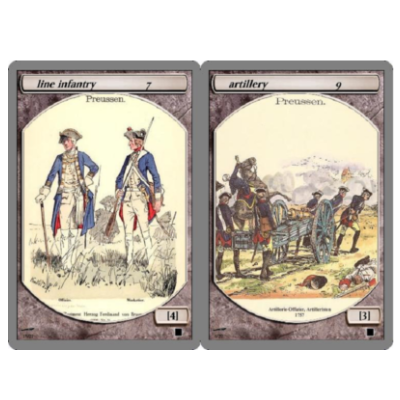 Why the game of „21“ (black jack) for a wargame? I like to play miniatures based wargame but sometimes i really have no time nor space to play them. Sometimes i just want to stay at the pub, tasting a beer, but playing a wargame. That’s why i started to design a portable wargame with modular terrain and even modular armies. For this purpose i managed to think about this wargame like a traditional game that might be played at Kings‘ Court in the XVIII century; that is the main reason to take the game of „21“ and use it to resolve units fight. In the end i liked to let the player feel the doctrines discussion on warfare for the period and to understand the way to wage war in the age of reason applying units to terrain and doctrines to units.