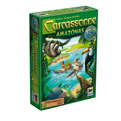 Mit Carcassonne um die Welt! Diesmal in die Tiefen des Amazonas Gebiets. Carcassonne Amazonas ist ein eigenständiges Spiel aus der Carcassonne-Welt. Ihr braucht kein anderes Spiel, um Carcassonne Amazonas zu spielen. Begebt euch in den Dschungel des Amazonas, wo sich Papageien, Tukane und andere Tiere tummeln. Jeder möchte die Dörfer besuchen, seine Camps am besten platzieren und der Schnellste auf dem Amazonas sein.