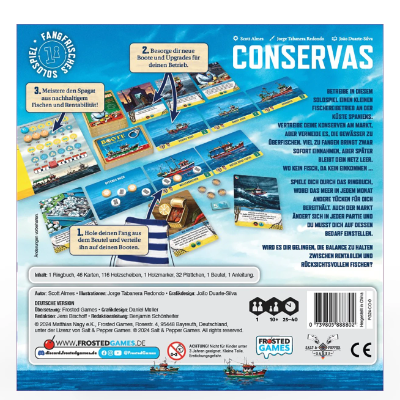 Conservas ist ein fangfrisches Solospiel ab 10 Jahren von Scott Almes. Betreibe einen kleinen Fischereibetrieb an der Küste Spaniens und vertreibe deine Konserven am Markt. Vermeide es dabei aber immer, die Gewässer zu überfischen, wenn dein Unternehmen auch zukunftssicher sein soll.
