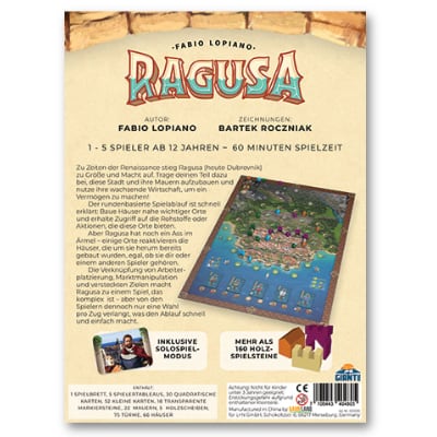 In Fabio Lopianos Ragusa errichten 1 bis 5 Spieler ab 10 Jahren die namensgebende Stadt im 15ten Jahrhundert. Indem du deine Gebäude strategisch platzierst, erlangst du Zugriff auf Ressourcen, produzierst Güter und beeinflusst die Märkte und den Handel. Die Spieler können auch Wälle und Türme errichten, um die Stadt zu verteidigen und sich somit Punkte für das Ende des Spiels zu verdienen.