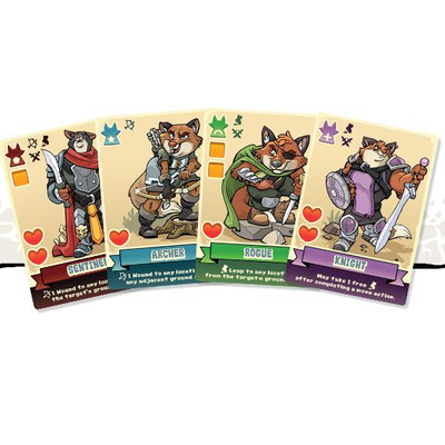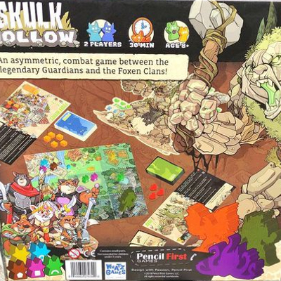 Skulk Hollow is a 2-player, asymetric, tactical combat game. Player use action cards to move their units, summon, and use special abilities. Taking down a guardian requires the Foxen player to leap onto the Guardian player board and take out different parts of the character.