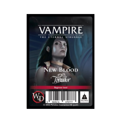 New Blood is a collection of five 55-card preconstructed decks for introductory games of Vampire: The Eternal Struggle. These decks are simpler than tournament level decks, but showcase all the basic mechanics of the game. They are balanced, for a fun and exciting first try of Vampire: The Eternal Struggle. Some of the cards included are reprints and some are new for this set, all ready to mix with cards from other sets.